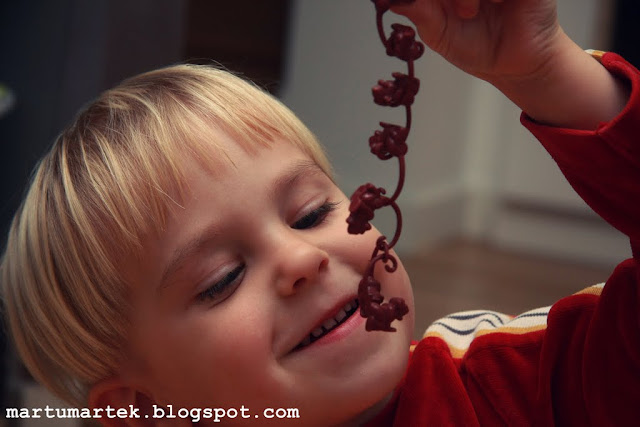 Załączam fotki zrobione podczas zabawy z Młodszym.Jego ukochana gra (dla mnie również;)) spadające małpki i niech ktoś spróbuje przetłumaczyć 3 latkowi,że wygrywa ten kto ma najmniej małpek;).Kolory świąteczne:)niech to będzie taka egzotyczna miniaturowa choinka.